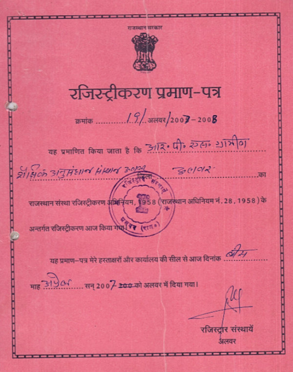 Sanskar College of Education is organised by R.P.S. Gramin Shekshnik Anusandhan Sansthan (Alwar). This Society was constituted and registered on 2007-08 and registration number is 19/Alwar/2007-08, with a pious objective of Educational, Social & Economical development.